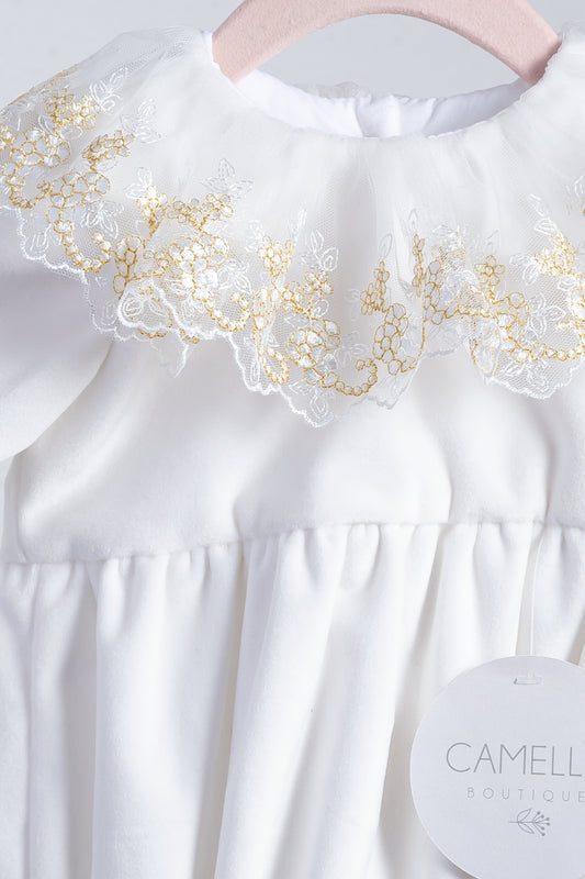 Ivoorkleurige velvet romper met gouden kanten kraag